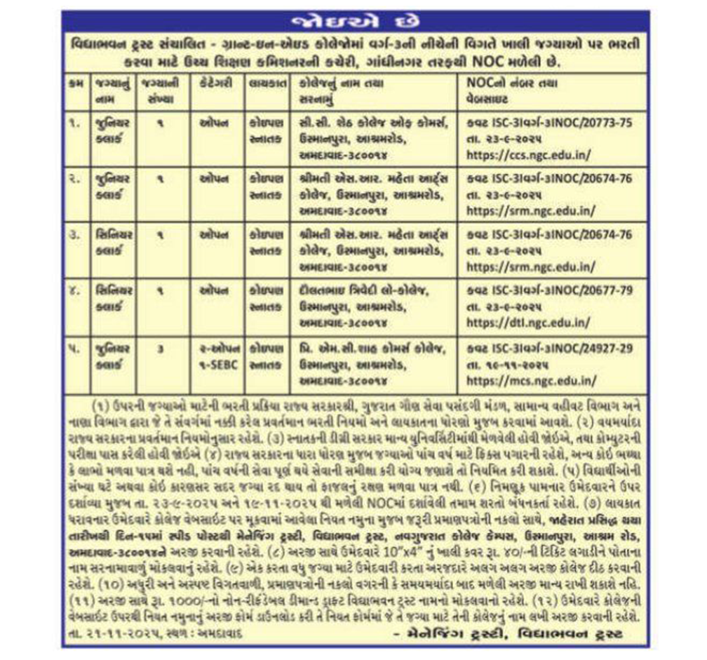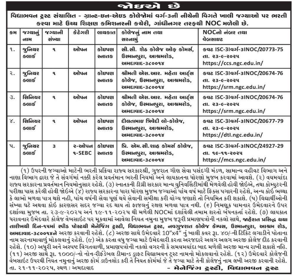 વિદ્યાભવન ટ્રસ્ટ સંચાલિત કોલેજોમાં જુનિયર ક્લાર્ક અને સિનીયર કલાર્કની જગ્યાઓની ભરતી માટે તા.૨૨.૧૧.૨૦૨૫ ના રોજ જાહેરાત આપવામાં આવી છે. જાહેરાતના મુદ્દા- ક્ર.(૯) માં સુધારો કરતાં જણાવવાનુંકે ઉમેદવારે ખાલી જગાઓ માટે એકજ અરજી કરવાની રહેશે અને જે તે જગા માટે ઉમેદવારે કોલેજો માટેનો પ્રેફરન્સ આપવાનો રહેશે. સુધારેલ એપ્લીકેશન ફોર્મ કોલેજોની વેબસાઈટ પર મુકવામાં આવેલ છે.